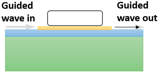 Excitation of the surface plasmons by waveguide coupling. Green layer indicates substrate, blue indicates waveguide, yellow indicates metal film, and black rectangle on the top indicates the dielectric [46].