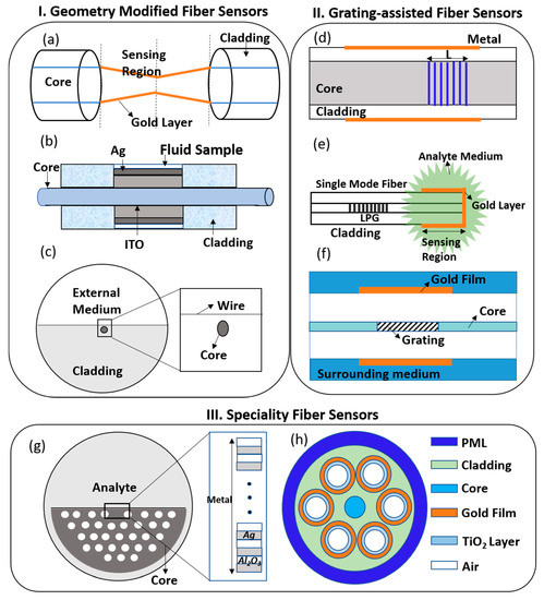Schematic illustration of various geometries of SPR sensors. In I: (a-c) are conventional geometry modified fiber sensors [22,56,61]; In II: (d-f) are grating-assisted fiber sensors [66,67,68]; In III: (g-h) are specialty fiber sensors [70,79].