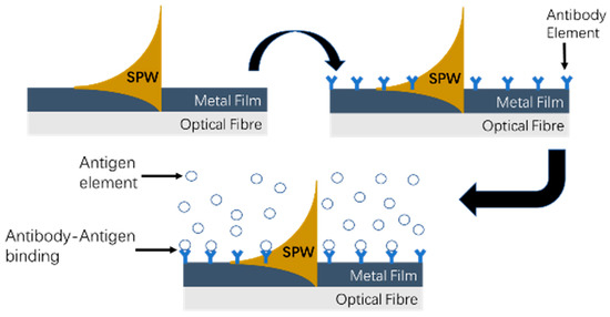 In a FOPS detection process for biosensing, first, light needs to be launched through an optical fibre coated by a thin layer of noble metal. Then the evanescent wave propagates along the silica‒metal interface and the maximum energy transfer from light to SPW occurs on the metal surface when its propagation constant is the same as that of SPW. The propagation constant of the SPW is extremely sensitive to the changes of the refractive index of the sample on the metal surface. Figure 8 illustrates an overview of the detection mechanism of a FOPS for antibody‒antigen binding. The antibody elements initially immobilize themselves on the metal surface and then the interaction between the antibody and antigen results in the refractive index change of the samples, which can lead to a shift in the resonance wavelength of the FOPS. This significant wavelength shift caused by the binding introduces the changes in the refractive index that can be detected by a precise optical spectrometer [93].