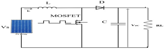 As the voltage of PV arrays is not sufficient as input into the inverters, a DC–DC boost converter should be connected in order to increase the DC voltage under certain conditions. The structure of the boost converter is shown in Figure 2.