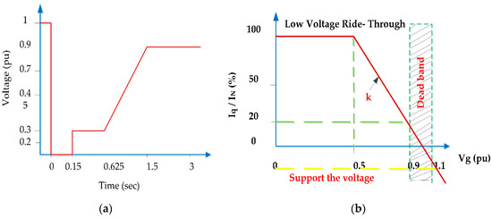 According to German E.ON grid code shown in Figure 3a, the SPV system should not be disconnected from the grid when the PCC voltage falls down to zero percentage of the nominal voltage for a period less than or equal to 0.15 s, and should recover to 90% of the voltage from its pre-fault level within 1.5 s from the occurrence of the voltage sag [30]. In addition, SPV systems should inject reactive current under fault conditions, depending on the voltage sag range and the inverter current rating capacity, to provide dynamic grid–voltage support according to the profile given in Figure 3b. According to the grid code (GC), the amount of reactive current that should be injected into the grid during voltage sag can be calculated by the following: