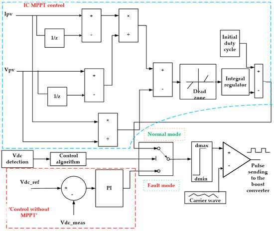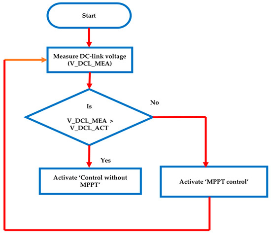 The operational flowchart is shown in Figure 5. Under fault conditions, initially the DC-link voltage is measured and compared with a actual DCL voltage. If it exceeds the actual value, the “control without MPPT” mode is enabled; otherwise, the MPPT control is enabled. The “control without MPPT” controller is enabled in the system until the DCL voltage is equal to the actual DCL voltage.