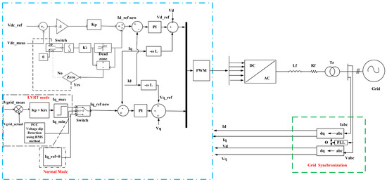 where id and vd are the d-axis components of the inverter current and voltage, iq and vq are the q-axis components of the inverter current and voltage, and vgd and vgq are the d-axis and q-axis components of the grid voltage. When controlling P and Q independently, the d-axis reference voltage (vd-ref) and q-axis reference voltage (vq_ref) will be obtained. They are converted into the stationary reference frame using the dq-abc transformation, and sinusoidal pulse width modulation (SPWM) signals are then generated accordingly. To provide the reactive power support to the grid under fault conditions, this work proposes a modified control system for the voltage source converter (VSC), as shown in Figure 6. During normal operating conditions, the inverter control system generates a d-axis reference current to maintain the DCL voltage by using an external voltage regulator, and maintaining the unity power factor. The d-axis reference current controller, designed with the back-calculation anti-windup method, is used to avoid the error accumulation of the integral part under fault conditions. The quadrature axis reference current (Iq_ref) is fixed to zero to keep the unity power factor under normal conditions.