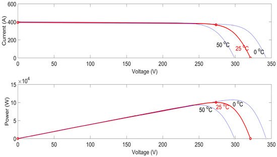 The given power system model (Figure 7) is simulated using MATLAB/Simulink software to evaluate the performance of the proposed control scheme. The PV array is used to deliver the maximum value of 100 kW at 1000 W/m2 irradiance; a boost converter is used to increase the PV voltage to 500 V DC; the I-V and P-V characteristics of SPV system are shown in Figure 8; the switching duty cycle is optimized by the MPPT controller under normal conditions; and the VSC converts 500 V DC to 260 V alternating current (AC) and retains the unity power factor, and is connected with the single machine-infinite bus (SMIB) system via step-up transformer. To validate the performance of the proposed LVRT control scheme for the grid connected PV system, the German E.ON grid code (GCC), shown in Figure 3, is taken as a reference.