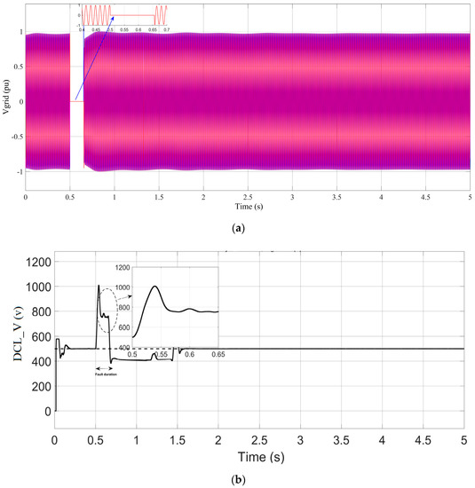 Equation (6) shows that the DCL voltage rise rate depends on the voltage sag level (Vg goes low during a fault) and the fault period (. In the case of severe fault conditions, the voltage drops as the PCC decreases to a lower level, and longer fault duration causes a higher rise rate for the generated DCL voltage. Thus, without any protection scheme under any type of fault, it may violate the DCL over-voltage standard.