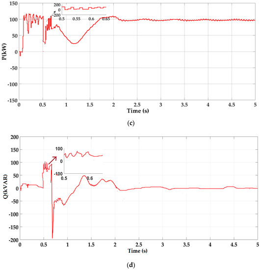 The simulation results of the grid-connected SPV system with MPPT control are shown in Figure 13. Figure 13a shows the response of the MPPT control scheme when an asymmetrical two-line to ground (2LG) fault (Phases ‘a’, ‘b’ to ground) occurs, with the voltage dropping to 0.21 pu from its nominal value (1.01 pu) for 150 ms, and therefore with voltage sag of around 20%. Figure 13b shows that the DCL voltage rises sharply to 1100 V, which trips the over-voltage protection circuitry. During a 2LG fault, the active power can be delivered to the grid by the healthy phase, unlike during a 3LG fault where no active power is injected into the grid. However, Figure 13c shows that the SPV system injects an average amount of 60 kW (i.e., 60% of the SPV rated power capacity) active power into the grid, which is not adequate under an unbalanced grid fault, since the grid point (PCC) voltage level is low. In this case, the inverter is overloaded (i.e., over-current). Figure 13d depicts that the SPV system injects less reactive power into the grid, which is not enough to support voltage recovery. Figure 14 shows the response of the proposed control scheme. DCL voltage is maintained at the maximum of 600 V, which has little oscillation, as shown in Figure 14a. Figure 14b illustrates that the SPV system output of active power has been effectively reduced to a null, and because of this the SPV inverter will not experience any severe over-current issues. At the same time, the SPV system injects an average amount of 200 kVAR of reactive power into the grid according to the GC in order to support voltage recovery, as shown in Figure 14c. In this case, the standard requires to provide 100% reactive current into the grid, it is shown in Figure 14d.