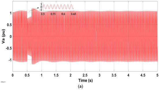 In this section, the effectiveness of the proposed control scheme is tested and compared with and without the proposed control (MPPT control) scheme under asymmetrical fault conditions. For this purpose, a single-line to ground (1LG) fault (phase A to ground) is applied in line 2 in Figure 7, at t = 0.5 s for 150 ms. The simulation results of the grid-connected SPV system without the proposed control scheme are shown in Figure 11. Observations from the grid voltage (phase ‘a’) profile Va in Figure 11a indicate that the voltage amplitude drops to Va = 0.71 pu from its nominal value Va = 1.01 pu, corresponding to a voltage sag of 70%. The DCL voltage is unstable with 1050 V over-voltage, which seriously exceeds the DCL over-voltage limitation, as shown in Figure 11b. The SPV system injects an average amount of 80 kW (i.e., 80% of the SPV rated power capacity) into the grid, which means the MPPT control scheme does not effectively reduce the output active power during the fault, as is demonstrated in Figure 11c, so that the SPV inverter experiences an over-current. This case inverter can be disconnected from the grid, which is a negative sign of LVRT enhancement.
