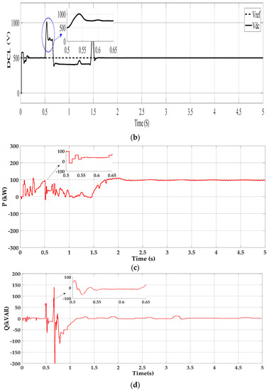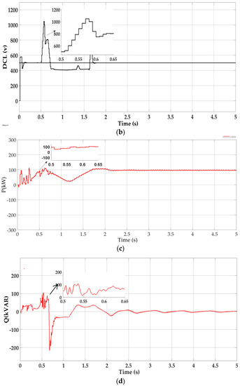 The simulation results of the grid-connected SPV system with the proposed control scheme are shown in Figure 12. As shown in Figure 12a, DCL voltage maintains the maximum value of 580 V with few fluctuations. It is worth pointing out that, when the voltage sag occurs, the DC side input current may not be equal to the output current, leading to flucation of the DCL voltage. Figure 12b shows that, with the proposed control scheme, the SPV system delivers less active power than the MPPT control scheme during the fault. The reason is that with the proposed control scheme the SPV system supplies the grid with reactive current as required in the GC (Figure 12d). This will reduce the active power flowing through the inverter to the grid. Hence, the SPV inverter will not experience any over-current, which is a positive sign of LVRT enhancement. Furthermore, the SPV system is injecting the required amount of reactive power according to the GC into the grid for voltage recovery (Figure 12c), and after the fault is cleared, the system goes back to its normal mode within the time limit mentioned in the GC.