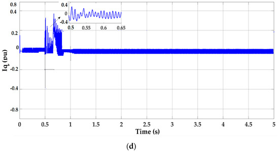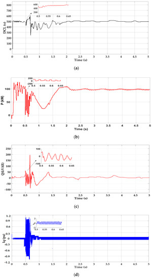 Simulation results of proposed control scheme under an asymmetrical fault (1LG). (a) DC-link voltage (DCL), (b) active power (P), (c) reactive power (Q), (d) reactive current (Iq).