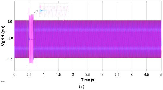 The LVRT performance of the system with the proposed control scheme is demonstrated under both symmetrical and asymmetrical fault conditions. To capture all the possible details, and for better representation, a uniform time span of 0–5 s used in the graph results. A zoomed-in portion is also provided inside all figures for better visualization. The simulation results are described in the subsequent sections.
