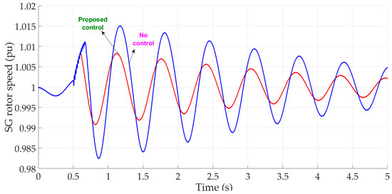 Synchronous generator (SG) rotor speed: no control and proposed control.