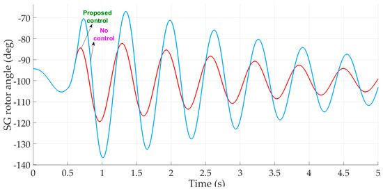 Synchronous generator (SG) rotor angle: no control (MPPT control) and proposed control.