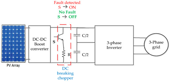 The number of renewable energy sources connected to the public grid is increasing significantly, due to the deregulation of electric power distribution industries and environmental issues. Among these renewable sources, photovoltaic (PV) technology will play an important role in the future of electricity generation. In the past, PV sources were commonly used in isolated and stand-alone applications. Nowadays, PV systems are commonly connected to the public grid and the generated power is sold, with advantageous price ratings fixed by governmental policies. The high penetration of solar photovoltaic (SPV) systems has resulted in several technical problems in the grid. The grid codes (GCs) are strictly adhered to in order for grid-connected SPV systems to avoid adverse effects on the power system [1,2,3]. Among the grid codes, the low-voltage ride-through (LVRT) capability of solar PV is important. According to the widely adopted E.ON Netz GmbH code, the PV system should be kept connected to the grid during grid disturbances, to provide dynamic grid support [4]. Extensive studies have been performed on enhancement of the LVRT of SPV systems via hardware solutions. A direct current (DC)-breaking chopper circuit can be coupled across the DCL to satisfy the GC with respect to the LVRT [5]. However, this method requires additional components, and dissipates a large amount of power during the fault condition. In research by Al-Shetwi and Sujod [6] an alternative approach for LVRT enhancement was proposed, by connecting the energy storage system (ESS) with the DCL to avoid excess energy being applied to the DC-link capacitor. However, this control method not only increases cost, but also requires frequent maintenance. The insertion of a series dynamic braking resistor (SDBR) improves the voltage sag by introducing impedance at the fault point [7]. This approach will enhance the LVRT capability of the PV system. However, the selection of the optimal resistance value for the SDBR is a challenging task. In Sabir’s work [8], an LVRT capability enhancement scheme for a hybrid PV–fuel cell system is proposed, in which a dump load is inserted to maintain an active power balance, DCL voltage, and grid currents within their limits under fault conditions. The dump loads used in the system will increase the power loss on the system in this method. In Yang et al. [9], fault-current limiters (FLCs) are proposed to reduce DCL fluctuations. Additionally, a novel intelligent damping controller (NIDC) has been proposed for the static synchronous compensator (STATCOM) to enhance the transient stability of the hybrid power multi-system [10]. However, all of the above approaches involve additional hardware costs.