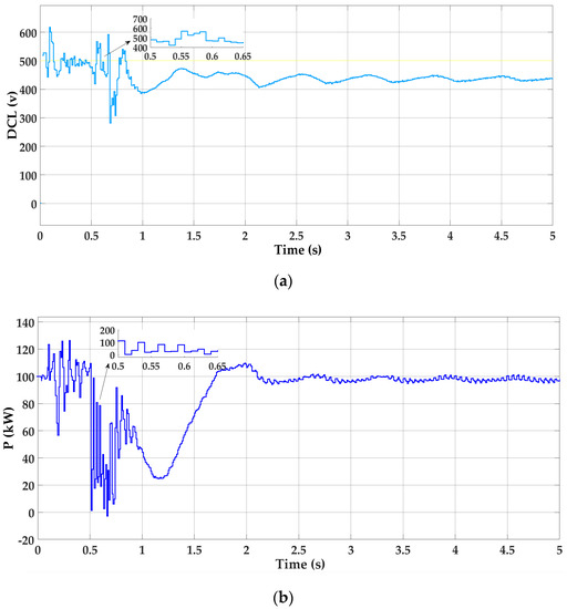 Simulation results of the DC-breaking chopper control scheme. (a) DC-link voltage (DCL), (b) active power (P).