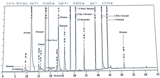 The same volatiles were purchased as standard compounds that were first identified at GC-MS in the preliminary study. The compounds Acetaldehyde, Acetone, Butanal, Butanone, Ethanol, Hex-Propanone and Hexanon were purchased from Chem Service (West Chester, PA, USA). The compounds Propanol, Eth-Butanol, Hexanal, 2 Meth-1-Pro-ol, Heptanal, 3Meth-1Butanol, Trans-2-Hexenal, Octanal were purchased from Sigma-Aldrich Corp. St. Louis, MO, USA. The compounds 2,3-Butanediol, Hex-Propanone, 1-Hexanol and 1-Pentanol were purchased from purchased from Alltech (Deerfield, IL, USA). These standard compounds were run on GC-FID and got a (Figure 1) of peaks of different volatiles according to their retention times. After that, the milk samples were run on GC-FID and identification and quantification of volatiles were achieved using detector response factors established from standard compounds and their retention time.