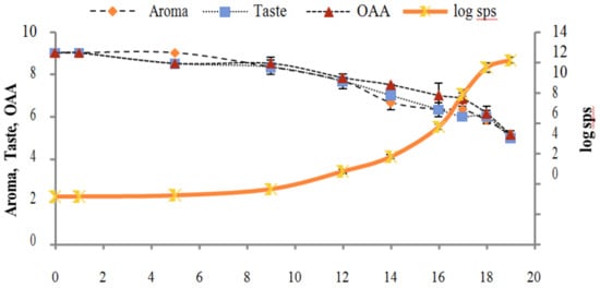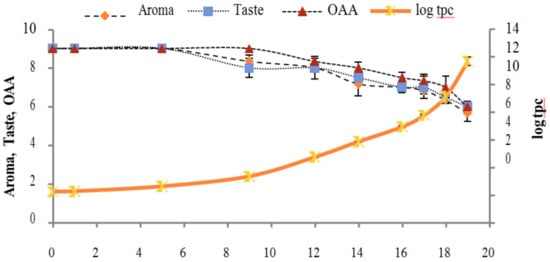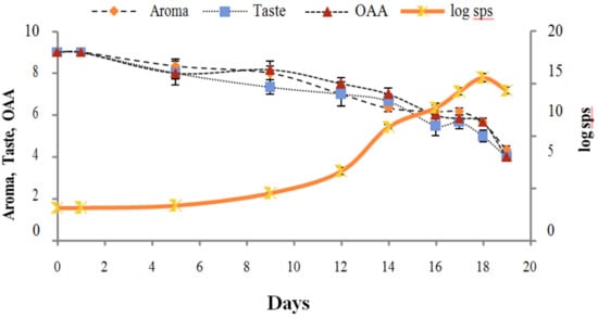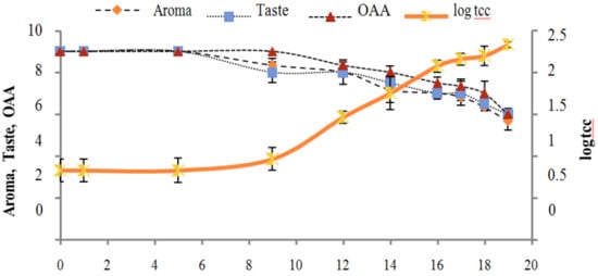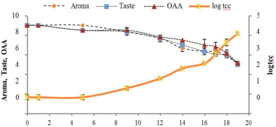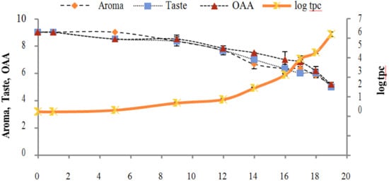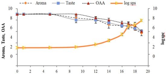 The results of sensory evaluation are shown in Table 5. In general, off-flavors increased more rapidly in milk stored at 10 °C than at 4 °C and 7 °C. After 14 days-storage, the overall acceptability score of milk stored at 4 °C was 8.00 ± 0.29, followed by at 7 °C (7.50 ± 0.00) and 10 °C (7.00 ± 0.00). Similarly, the score of taste and aroma at day 14 was (7.50 ± 0.00, 7.17 ± 0.60), (7.00 ± 0.00, 6.67 ± 0.33) and (6.67 ± 0.33, 6.33 ± 0.17) at 4 °C, 7 °C and 10 °C, respectively. The overall acceptability of milk samples, after 19 days of storage, at 4 °C was (score 6.00 ± 0.00) going to spoil, and at 7 °C and 10 °C were badly spoiled, with scores of respectively, 5.17 ± 0.17 and 4.00 ± 0.00. Overall, the obtained sensory results agree with those of Lloyd et al. [], who reported that storage-induced changes in sensory characteristics, volatiles and primary amines depend on both differences in lactose content and the applied heat processing, as well as with the results obtained by Li et al. [], who reported that aldehyde and ketone compounds may play a major role in controlling the oxidized flavor, which was influenced by pre-heating as well as concentration and drying during milk powder production. The standard plate count (SPC, Log10) was (2.91 ± 0.03 CFU/mL, 5.77 ± 0 CFU/mL and 14.88 ± 0.03 CFU/mL), at day 14, and (5.78 ± 0.01 CFU/mL, 17.25 ± 0.03 CFU/mL and 21.89 ± 0.01 CFU/mL), at day 19, respectively, at 4 °C, 7 °C and 10 °C. This has previously been noted by Labuza [] and Maxcy and Wallen [], who reported that the most reliable method to judge fresh milk quality is sensory evaluation.