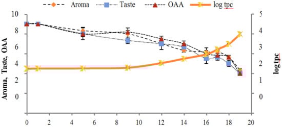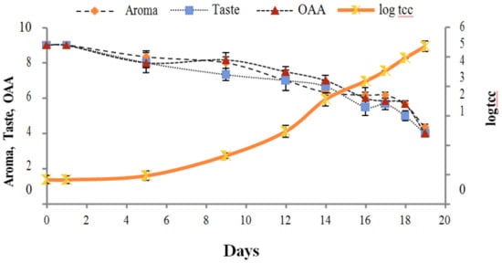 Sensory stability of the samples was estimated by a trained panel, consisting of 10 members. Panelists were asked to evaluate the sensory attributes of aroma, flavor and overall acceptability by assigning a liking score on a 9-point hedonic by Meilgaard et al. [].