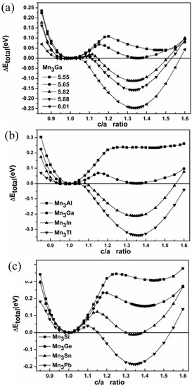 (a) Total energy as functions of c/a ratio for Mn3Ga alloy with different volume (V = 17.0 nm3, 18.0 nm3, 19.0 nm3, 20.0 nm3, 21.0 nm3, 22.0 nm3). (b) Total energy difference (per formula unit) relative to the cubic phase as a function of c/a for Mn3Z (Z = Al, Ga, In, Tl) and (c) for Mn3Z (Z = Ge, Sn, Pb) alloys.