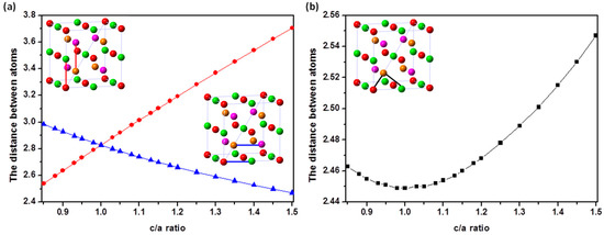It is well known that with the increase of the distance between the main group Z atom and the nearest neighbor Mn(A) and Mn(C), the hybridization strength of the p-d orbitals between Z and Mn(A/C) atoms is weakened [34]. Before we start to analyze the magnetic properties, we perform an investigation on the change of the relative position of the atoms in Mn3Z alloys during the tetragonal distortion. As shown in Figure 3a, the distance between Z and Mn(B) and the distance between Mn(A) and Mn(C) along the c axis increase linearly with the increase of the c/a ratio in the process of tetragonal distortion, while the distance between Z and Mn(B) and the distance between Mn(A) and Mn(C) along the a or b axis decreases linearly with the increase of the c/a ratio. Figure 3b show the changing curve of the distance between two nearest-neighbor atoms with the change of c/a ratio. It is clear that the distance of between two nearest neighbor atoms decreases first, and then increases with the increase of the c/a ratio and get a minimum at c/a = 1.