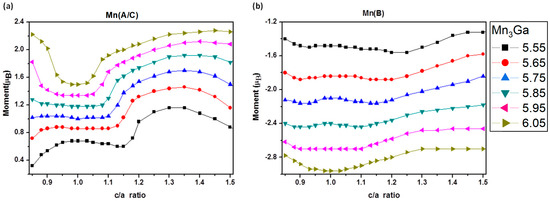From Figure 4a, it can also be seen that when c/a > 1, the moment of Mn(A/C) first increases and then generates a downward trend. We might consider the case of c/a < 1 to understand the situation. Firstly, with the increase of c/a ratio, the distance between Mn(A/C) and Ga (also Mn(B)) increases. So, the p-d (d-d) covalent hybridization decreases and the moment of Mn(A/C) increases. Secondly, the distance between Mn(A) and Mn(C) atoms along c axis increases. Thus, the d-d covalent hybridization was weakened and the magnetic moments of Mn(A/C) increase. Thirdly, with the increase of c/a ratio, the distance between the Mn(A) and Mn(C) along the a or b axis decreases, which leads to the strengthened of d-d covalent hybridization between them and a decrease of the Mn(A/C) moment. So, we can know that the Mn(A/C) magnetic moment increases first, and then decreases with the increase of c/a, which may be attributed to the change of covalent hybridization originating from the change of interatomic distance. Furthermore, with the increase of volume, the position of the inflection point to go down gradually shifts to the right. This is because Mn3Ga alloy with larger volume needs a larger degree of distortion (a larger c/a ratio) to make the distance between Mn(A) and Mn(C) along the a or b axes sufficiently small to achieve the same strength of d-d orbital covalent hybridization.