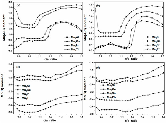 The atomic magnetic moments of Mn(A/C) (a,b) and Mn(B) (c,d) as functions of c/a ratio for Mn3Z (Z = Al, Ga, In, Tl, Si, Ge, Sn, Pb) alloys.