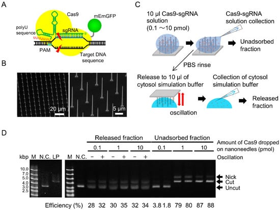 Estimation of cleavage activity of RNP released from nanoneedle array (NNA). (A) A schematic of Cas9 and poly-U containing single guide RNA (sgRNA) ribonucleoprotein (RNP) cleaving double stranded DNA. (B) Scanning electron microscope images of fabricated NNAs. (C) Schematic of RNP adsorption and release. The RNP solution was poured on the hydrophobized NNA and collected as the unadsorbed fraction. The RNP-adsorbed nanoneedle array was immersed in cytosolic simulation buffer. The buffer was then collected as the released fraction. (D) Electrophoresis of cleaved plasmid DNAs in unadsorbed and released fractions. Super-coiled plasmid DNA coding EGFP (negative control, N.C.) and linearized plasmid (LP) by restriction enzyme were used.