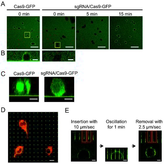 Cas9 protein contains an arginine-rich α-helix domain that interacts with sgRNA [27]. Since the cationic domain was expected to electrostatically interact with the negatively charged cell surface, the behavior of the Cas9-mEmGFP fusion protein was verified with or without sgRNA. The addition of the Cas9-mEmGFP solution to HEK293 cells in a culture dish resulted in the immediate adsorption of Cas9-mEmGFP onto the cell surface (Figure 2A,B). By contrast, Cas9-mEmGFP forming an RNP complex with sgRNA at a ratio of 1:10 was not adsorbed onto the cell surface. While the adsorption of RNPs onto the cell surface was observed after 15 min, the adsorption of Cas9 was inhibited by interaction with sgRNA, which was possibly due to the neutralizing of positive charges derived from the arginine-rich domain. Because the total time taken by the NNA for the insertion of RNPs was less than 1 min, the adsorption of RNPs on cells during nanoneedle insertion ceased to be a factor. Cas9-mEmGFP proteins with or without sgRNA were incorporated into the cytosol after 22 h (Figure 2C), indicating that protein adsorption onto the cell surface progressed via endocytosis. Due to difficulties associated with escape from endosomes, most delivered molecules are degraded, indicating that direct delivery of Cas9 into the nucleus maybe preferable for genome editing purposes. Nanoneedles on the NNA are shown, indicating that at least one nanoneedle was inserted into a red fluorescent HEK293 cell (Figure 2D; green dots). Dark areas in the cells without red fluorescence are nuclei. The probability of the nucleus contacting nanoneedles was estimated to be about 70%, and the percentage of cells that contacted multiple needles was about 10%. Moreover, fluorescence intensities of the nanoneedles decreased after retraction from the cells, indicating that Cas9-mEmGFP had been successfully released from the surface of the nanoneedles (Figure 2E). Therefore, we concluded that our NNA system may be used for direct delivery of Cas9-sgRNA RNPs into living cells.