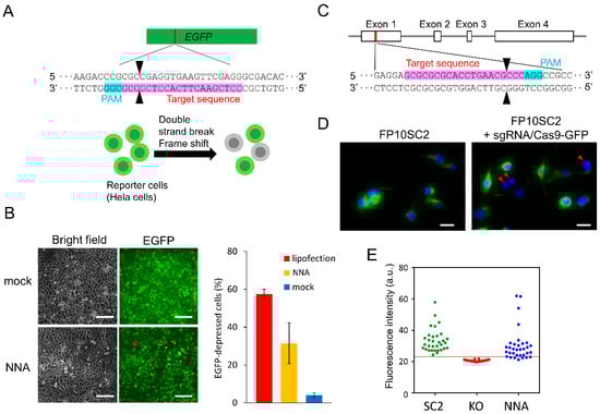 Gene disruption in mammalian cells by direct delivery of the RNP complex. (A) Schematic of the EGFP disruption. (B) EGFP disruption in reporter cells (n = 3). Left panel shows bright field and fluorescence images of the portion of cells that were cultured for 48 h after the insertion of bare NNA (mock) or RNP delivery using NNA. Scale bar: 200 μm. Right panel shows the ratio of EGFP-depressed cells. RNP was introduced by lipofection (red) or NNA (yellow), respectively and the mock-treated cells was showed in blue. (C) Schematic representation of the mouse nestin gene and the sgRNA targeting sequence. (D) Immuno-stained FP10SC2 cells after delivery of RNP with the NNA (right) and negative control (left). Green indicates nestin, and blue indicates the nucleus stained with DAPI. Scale bar: 20 μm. (E) Fluorescence intensity threshold for estimating nestin deficient cells. Parental cells (SC2; green; positive control), nestin knockout cell line 5NK-H10 (H10; red; negative control), and RNP introduced cells by NNA (blue). Red line indicates the average fluorescence intensity of H10 plus five SD. The demonstrated plot and threshold were based on an experiment replicated 7 times. The target sequence of sgRNA and protospacer adjacent motif (PAM) are depicted in pink and light blue. Black arrowheads indicate cleavage sites. Red arrowheads indicate target-protein-deficient cells.
