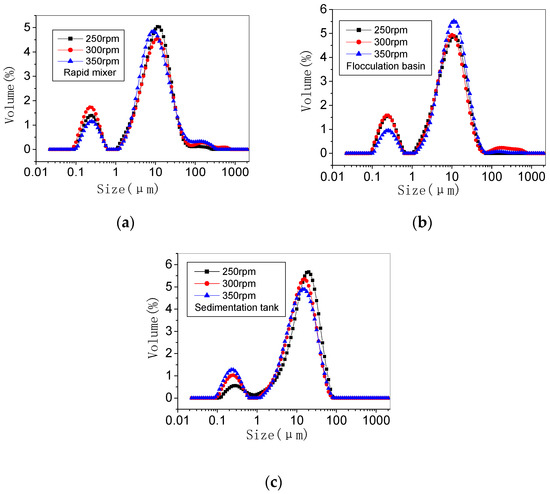 Floc size distribution with different rapid mixing for three stages. (a) rapid mixer; (b) flocculation basin; (c) sedimentation tank.