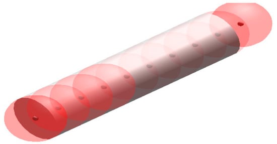 The spheres present the points that can estimate the center axis and radius of the cylinder. Figure 2 shows a sphere with the same diameter as the cylinder moving along the inside of the cylinder, leaving a trace of the center point. In the point cloud, a center point and a radius can be calculated, as shown in Figure 2, if it performs spherical fitting through neighboring points around a point.