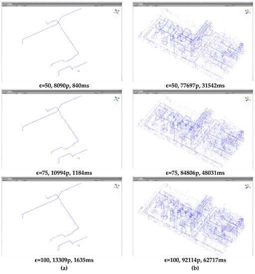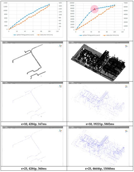 The reason why the linear ratio of Figure 12b in Table 1 is high is because one pipe is estimated to be a plurality of truncated pipes. Table 1 shows similar results even though there are differences in the size and density of data between Figure 12a and b. There are many cases where the pipe of the plant is constructed vertically/horizontally on the ground, but there are also cases where it is installed in a diagonal line, which means that additional calculation is necessary when constraints exist [9]. In addition, the bend area is calculated by finding the intersection point by extending the length from the result of finding the straight pipe and the 90° or T-shaped area. On the other hand, the proposed method can find not only vertical and horizontal regions, but also oblique regions, and S-shaped region estimation is also possible. The execution time is equal to O(n(P) n(L) n(E) c), where n(P) is the total number of data points, is the sphere fitting search increment, n(L) is the number of linear candidates/estimators, n(E) is the number of curved region candidates/estimators, and c is the evaluation cost. Eventually the appropriate value needs to be set in order to reduce execution time. In other words, the number of central axis data points determined by affects the amount of computation of n(L), n(E), and c. Therefore, the proper setting of has a great influence on overall performance.