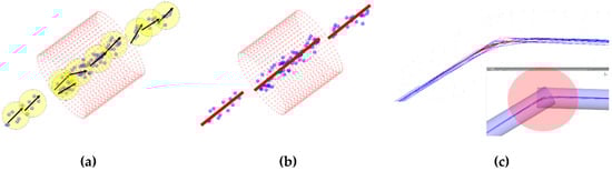 Figure 7 depicts the central axis estimation. Figure 7a is the result of calculating the eigenvectors based on the neighboring points at one point, and Figure 7b is the result of estimating the direction and length through the sum of the eigenvectors satisfying a certain criterion. Here, the criterion is the distance and angle between two vectors. That is, if the angle formed by two vectors and the distance are within a certain range, the two vectors are one vector. At this time, the radius average of a set of points constituting one vector is the radius of the cylinder. Figure 7c is the result of matching the straight line through the sum of the eigenvectors (blue lines).