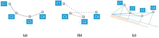 Curves by Catmull–Rom splines should have control points in order. In the case of four control points, Figure 10a shows the points in order and Figure 10b shows the points without order. Therefore, the order of the control points must be determined for the curve configuration.