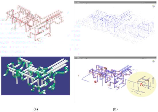 Figure 13a shows an execution time of 591 s. Figure 13b shows that step 1 took 16 s and step 2 took 10 s. Therefore, it was 591/(16 + 10) = 22.73 times faster to estimate the pipe. A total of 89 left (CE) pipes exist in the left data, and the proposed method estimated 130 straight lines (CD) and 90 curves (CC). This seems to be better than the comparison of 60 CD. However, since the comparison object is estimated to have detected only the area of the top image of Figure 13a, the result of linear/curve estimation of the right area added in the top image of Figure 13b should be removed. The added right-hand region has about 50 straight lines and 15 curved lines. As a result, a straight line/curve of 80 (CD) and 75 (CC) was estimated. Here, the error is 10 (CF). This is a result of estimating a strict standard (constant length/position/angle). CD/CE is 0.9 and CT/CD is 0.88, which is somewhat greater than the 0.67 and 0.87 of the comparison subjects.