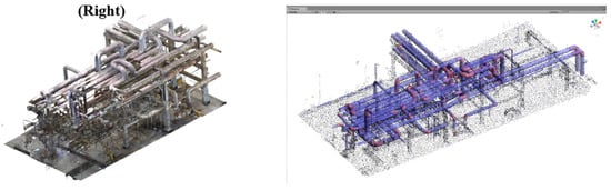 Abusaina estimated spherical structures using Hough transform. In order to speed up the computation, the authors proposed a method to increase speed and maintain accuracy by partially performing the calculation without searching the entire point cloud [4]. Zhang estimated the roof through RANSAC. The authors proposed a multi model fitting method by applying Bayes’ rule and a PCA algorithm to extend plane fit [5]. Garcia proposed a mathematical definition of various basic shapes to be applied to RANSAC and a primitive shape decomposition algorithm for estimating objects containing basic shapes in order to apply basic shape fitting to robot grasping [6]. Su used Hough transform to estimate cylinder shape. Cylinder estimation requires a 5D Hough transform, which is computationally inefficient and generally computed separately in 2D and 3D. The authors proposed a multiple cylinder detection method using a coarse-to-fine approach and a clustering algorithm [7]. Jones proposed a method of evaluating 3D point cloud histograms through support vector machine (SVM), which is the most similar to the model in the database [8]. Liu first extracted and removed the data vertically and horizontally from the ground, called T1 and T2. After that, Hough transform was used to project a plane on the normal vector and propose a cylinder shape estimation method through circle fitting [9,10,11]. Son determined the central axis of the pipe by the skeleton extraction algorithm through Laplacian smoothing and estimated the curved region and the T shape of the cylinder by dividing [12]. Huang classified meaningful data through fast point feature histogram (FPFH) and SVM and segmented it with the classical flood-fill algorithm. Matching was completed through RANSAC in the segmented data. However, the proposed method found only relatively complex shapes such as ball valves and flanges, because those have unique feature points. In other words, a unique feature point is needed for histogram comparisons [13]. Pang extracted primitive models using FPFH in point clouds and recognized objects through Adaboost with library models. The recognition object is merged/adjusted based on directionality and start/end position, and the automatic modeling is completed. However, it takes more than 30 minutes for 10 million pieces of data [14]. Rongqi computed one plane of normals on the Gaussian sphere after normal estimation through RANSAC. Projection of segmented points on the plane estimates the radius and length of the cylinder. If there is an intersection point with another cylinder through the estimated starting and ending points of the cylinder, it is judged as an elbow. Experimental results show relatively accurate results, but it required a lot of execution time [15].