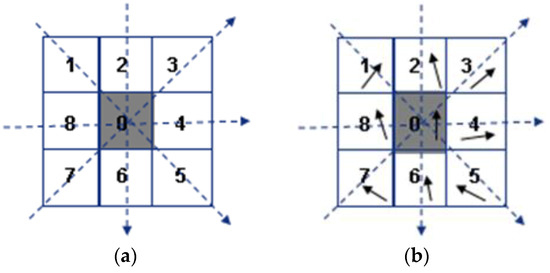 where and respectively indicates the orientation value of the middle pixel and the adjacent one (as shown in Figure 4b).