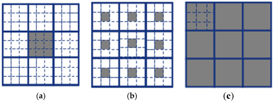 To combine multi-scale representation information, the three computing modes are further designed, including the original mode, the central mode and the average mode. The pixels in the different neighborhoods are selected for each mode. The adjacent pixels of the current pixel are selected for the original mode. The central pixels in the 3 × 3 adjacent blocks are selected for the central mode. The averages in the adjacent blocks are selected for the average mode. The grey regions in Figure 5 indicate the selected pixel set of different modes.