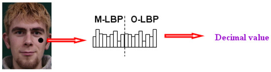 The information along the four directions in M_LBP and O_LBP is respectively encoded into four binary codes. The two features are linearly concatenated into eight binary codes, which can produce 2^8 = 256 binary patterns, just like the original 8 neighbors LBP. The modified LBP features are extracted from each pixel and can be regarded as the pixel value of a grey image. Thus, the input image is encoded as the three LBP images which contain multi-scale representation information (as shown in Figure 6).
