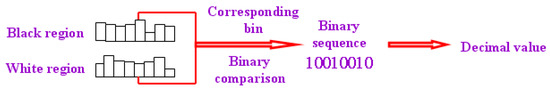 where and indicate the bins of black and white region histograms, indicate the index of component. Then a binary sequence is obtained and 8-bit binary values can be converted to a decimal number by , within the range of 0~255.