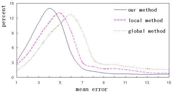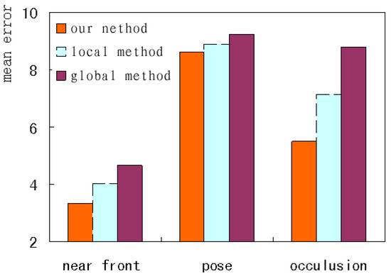 To further analyze the performance under different image conditions, this paper selected three kinds of test images, i.e., near-front, pose and occlusion, to form the difficult test set, and investigates the corresponding mean errors. As shown in Figure 17, our method has the fewest errors, and the global method has the most. The variation tendency under the three kinds of conditions remains in accordance. Our method improves performance by globally constraining the shape and carefully adjusting the local contour simultaneously.