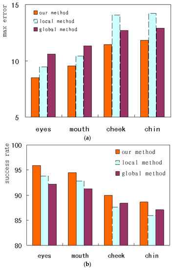 To compare the performance on the different landmarks, this paper investigates the accuracy of face alignment on the internal regions and the external contour. The comparisons on the HELEN database are shown. Figure 16a,b respectively indicates the max error and the success rate of the alignment on the different landmarks. From Figure 16a, it can be seen that our method for the eyes has the lowest max error, i.e., less than 8.5. The local method on the chin has the largest max error, higher than 12. On the eyes and mouth, the local method has a lower max error than the global method. But on the cheek and chin, the global method has a lower max error. From Figure 16b, it can be seen that our method on the eyes has the highest success rate, i.e., higher than 95%. The local method on the chin has the lowest success rate, less than 86%. On the eyes and mouth, the local method has a higher success rate than the global method. But on the cheeks and chin, the global method has a higher success rate. The above results show that the local method tends to converge to the local optimum in those regions what have few texture variations; additionally, the global method can reach the global optimum on the contours. The performance can be improved by combining different methods applied to different face regions. Accordingly, our method on the eyes has the best performance.
