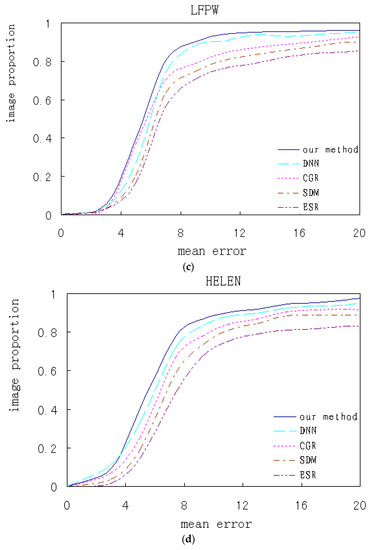 Our algorithm and the contrastive ones are respectively trained and test experiments are performed on several databases. The qualitative analysis and quantitative comparison based on the corresponding experimental results are shown. Figure 18 shows the cumulated error curves of different algorithms on different databases, where the x-coordinate indicates mean alignment error and the y-coordinate indicates test image proportion.