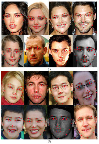 Several multitask deep convolutional networks have been constructed in the cascade manner for jointly achieving face detection, face alignment, pose estimation, and gender recognition [8,9,10]. Head pose is estimated and face variations can be globally restricted by integrating the different deep networks [11]. Three-dimensional information is introduced into the popular CNN networks’ frameworks to extract deep features in face alignment [12,13,14].