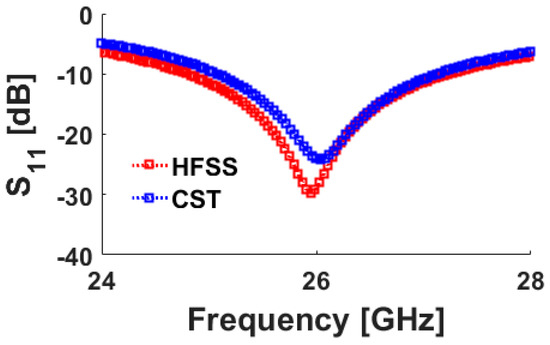 As shown in Figure 1, the antenna is fed by a coax-to-microstripline. The feeding point of the coaxial cable has been surrounded by a cylindrical metal vias. It is seen that the inner connector of the probe is connected to the feed line of the Yagi’s arm while the outer connector has been connected to the ground plane. The final dimensions of the proposed Quasi-Yagi antenna and its linear array parameters are specified in Table 1. Figure 2 depicts the frequency response (S11) of the Quasi-Yagi antenna. For comparison purposes, the antenna element was also designed using Ansoft high frequency structure simulator (HFSS) software [20], and its S11 result has been added to Figure 2. As shown, more than 2 GHz bandwidth with good impedance-matching function in the frequency range of 25 to 27 GHz has been achieved.