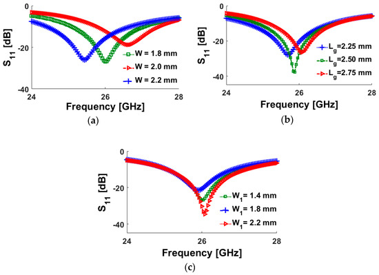 S11 results of the Quasi-Yagi antenna for different values of (a) W (width of the antenna arm), (b) Lg (length of the ground plane), and (c) W1 (length of the directors).