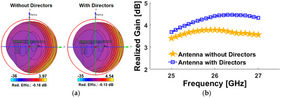 Using the directors, the antenna can provide a well-defined and more directional end-fire radiation pattern. It can also improve the gain level of the antenna at the operation frequency. Figure 6 illustrates a comparison of the antenna radiation behavior with/without the directors. As seen in Figure 6a, the antenna with directors can provide a good radiation pattern with higher gain and efficiency properties at 26 GHz compared with the antenna without the directors. In addition, as illustrated in Figure 6b, using the directors, the realized gain function of the antenna over the operation band has been increased significantly.