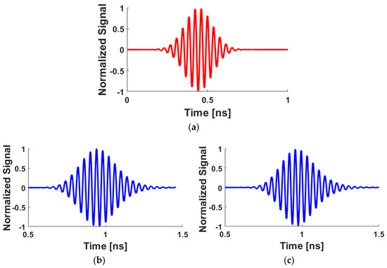 (a) Transmitted signal in free space and received pulses for (b) side by side and (c) face to face.