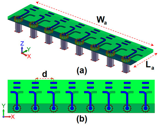 (a) 3D transparent and (b) top views of the linear phased array antenna.