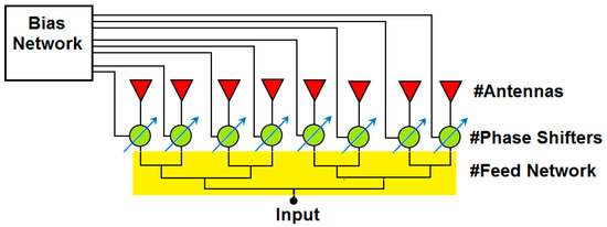 Transparent and top views of a linear phased array design with the Quasi-Yagi antenna elements are shown in Figure 8. It has a low profile of Wa × La = 9 × 40 mm2. The antenna elements are arranged with a distance of d = 5 mm. As it can be observed, it is composed of eight 26 GHz Quasi-Yagi antenna elements and could be used on the top/bottom portions of the smartphone PCB to form two sets of linear phased arrays [24,25]. Figure 9 shows a phased array system architecture with a feeding network that could be used for the linear phased array Quasi-Yagi antenna and can be demonstrated using phase shifters for beam switching. Various techniques of feeding network design such as parallel and series can be employed for this purpose.