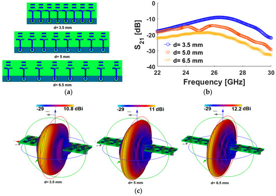 (a) Configurations, (b) S21, and (c) radiation beams of the linear array for different vales of d.
